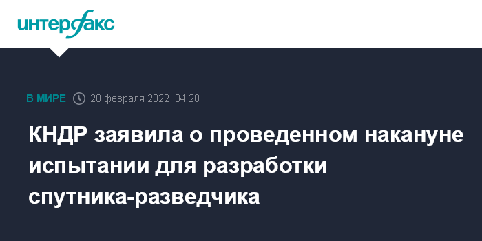 Москва. 28 февраля. INTERFAX.RU - Северная Корея заявила в понедельник, что провела "важное испытание" для разработки "разведывательного спутника", сообщает ЦТАК.