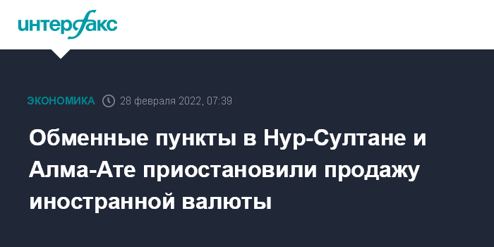 Москва. 28 февраля. INTERFAX.RU - Обменные пункты в столице Казахстана Нур-Султане и крупнейшем городе страны Алма-Ате в понедельник приостановили продажу и покупку долларов, следует из данных сайта Kurs.kz.