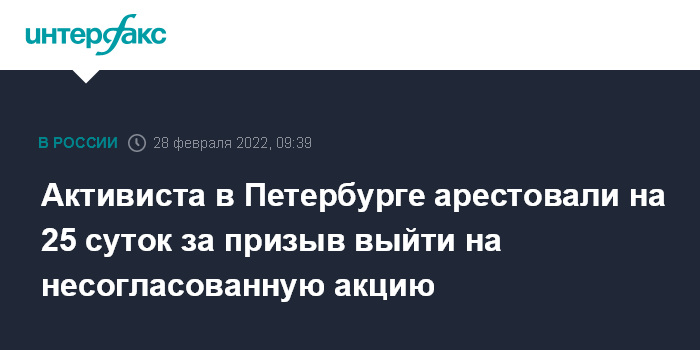 Активиста в Петербурге арестовали на 25 суток за призыв выйти на несогласованную акцию
