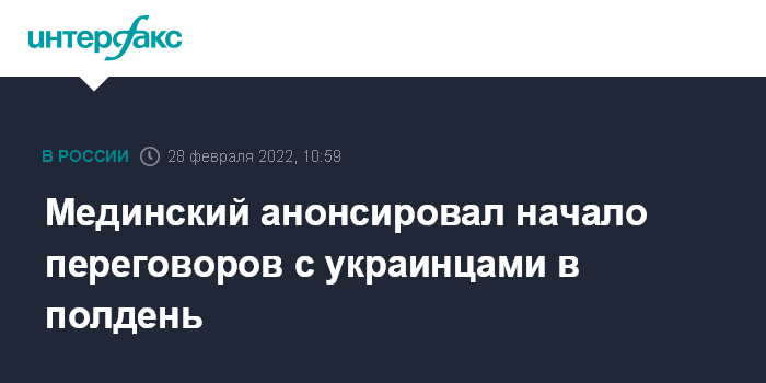 Москва. 28 февраля. INTERFAX.RU - Помощник президента России, бывший министр культуры Владимир Мединский заявил "БелТА", что переговоры с украинской делегацией начнутся в понедельник в 12:00.