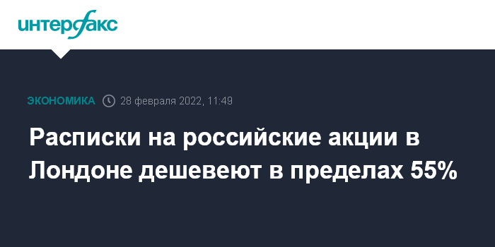 Москва. 28 февраля. INTERFAX.RU - Расписки на российские акции в Лондоне утром в понедельник дешевеют в пределах 55% на фоне усиления антироссийских западных санкций из-за военной операции России на Украине, в то время как торги акциями на "Мосбирже" временно приостановлены по распоряжению Банка России.
