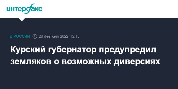 Москва. 28 февраля. INTERFAX.RU - Губернатор Курской области Роман Старовойт предупредил жителей приграничных районов региона о возможных терактах и диверсиях, но пока там все спокойно, граница охраняется надежно. Он сообщил об этом телеканалу "Россия 24".