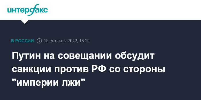 "Я пригласил вас для того, чтобы поговорить о вопросах, связанных с экономикой, финансами. Мы с Михаилом Владимировичем (Мишустиным, премьером России - ИФ) предварительно обсуждали эту тему, имея в виду, конечно, и те санкции, которые сейчас так называемое западное сообщество - как я его назвал в своем выступлении, - это "империя лжи", - пытается реализовать в отношении нашей страны", - сказал Путин, открывая совещание.