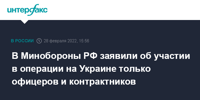 Москва. 28 февраля. INTERFAX.RU - В военной операции России на Украине участвуют только офицеры и контрактники, сообщил официальный представитель Минобороны РФ Игорь Конашенков.