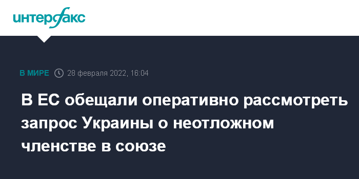 Москва. 28 февраля. INTERFAX.RU - В ЕС ожидают, что запрос президента Украины Владимира Зеленского неотложно предоставить его стране членство в союзе поступит в самое ближайшее время, после чего начнется процедура его рассмотрения, заявил в понедельник на условиях анонимности высокопоставленный европейский чиновник.