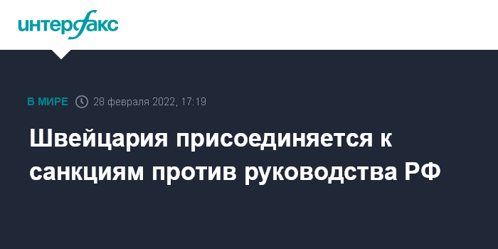 "Швейцария также вводит введенные ранее ЕС санкции против российского президента Владимира Путина, премьер-министра Михаила Мишустина и министра иностранных дел Сергея Лаврова, они вступают в силу незамедлительно", - говорится в пресс-релизе, распространенном Федеральным советом Швейцарии.