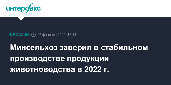 Москва. 28 февраля. INTERFAX.RU - Производство продукции животноводства в РФ в 2022 году будет стабильным, положительная динамика развития отрасли сохранится, сообщает Минсельхоз.