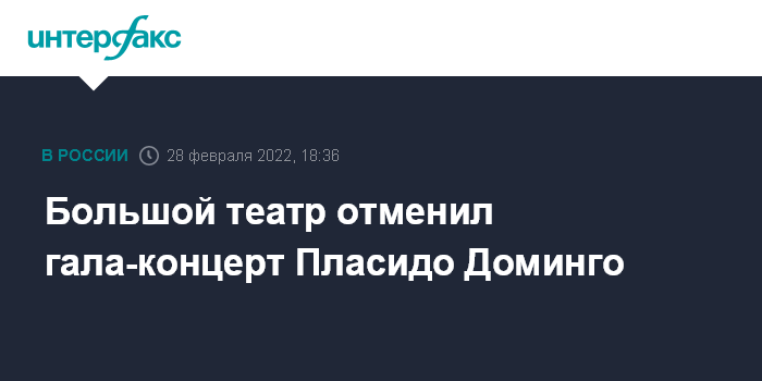 Москва. 28 февраля. INTERFAX.RU - Государственный академический Большой театр отменил концерт испанского тенора Пласидо Доминго "Весна. Любовь. Опера" который должен был состояться 8 марта.