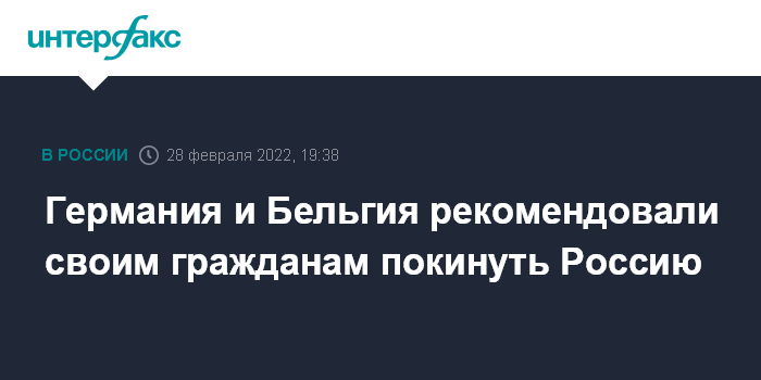 Москва. 28 февраля. INTERFAX.RU - Власти ФРГ и Бельгии рекомендовали своим гражданам покинуть Россию, Лондон посоветовал британцам не ездить в Россию без острой необходимости.