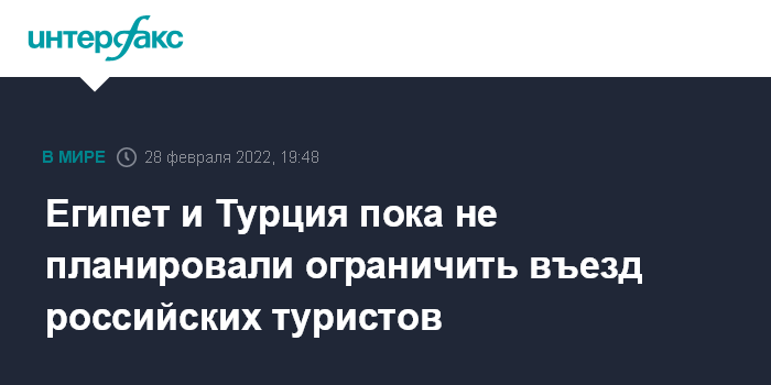 Москва. 28 февраля. INTERFAX.RU - Власти Египта и Турции в настоящее время не планируют вводить ограничения на въезд российских туристов, сообщает пресс-служба Ростуризма.