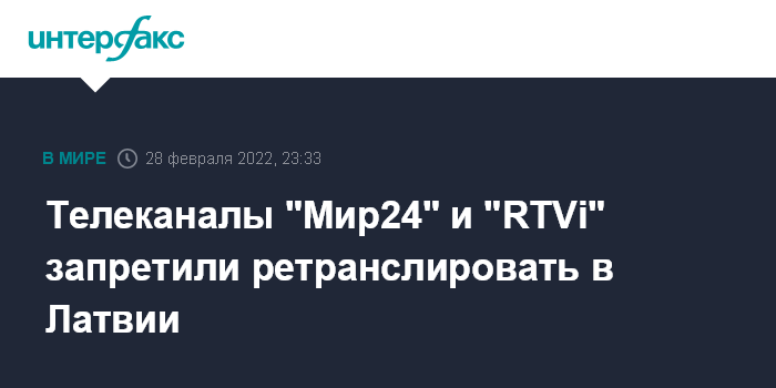 Москва. 28 февраля. INTERFAX.RU - Национальный совет по электронным СМИ (НСЭСМИ) Латвии запретил ретранслировать на территории страны телеканалы "Мир24" и "RTVi", сообщил агентству BNS председатель совета Ивар Аболиньш.