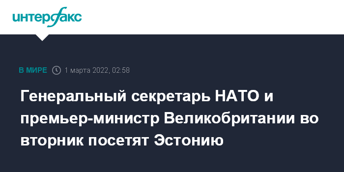 Москва. 1 марта. INTERFAX.RU - Генеральный секретарь НАТО Йенс Столтенберг и премьер-министр Великобритании Борис Джонсон посетят во вторник Эстонию.
