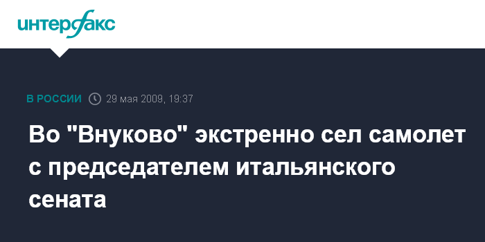 Рим. 29 мая. INTERFAX.RU - Лайнер Airbus A-319, который должен был доставить председателя итальянского сената Ренато Скифани из Москвы в Рим, сразу после взлета совершил в пятницу вынужденную посадку в аэропорту "Внуково", сообщает Corriere della Sera.