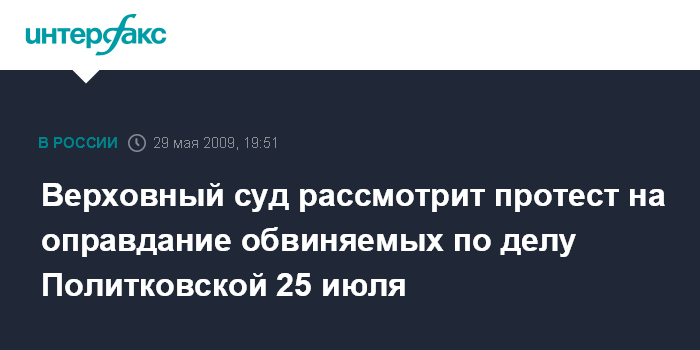Москва. 29 мая. INTERFAX.RU - Верховный суд РФ 25 июня рассмотрит протест Генпрокуратуры РФ на оправдательный приговор по делу об убийстве Анны Политковской, сообщила "Интерфаксу" адвокат потерпевших Анна Ставицкая.