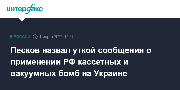 Москва. 1 марта. INTERFAX.RU - Пресс-секретарь президента РФ Дмитрий Песков заявил, что сообщения о якобы использовании российскими военными кассетных и вакуумных бомб на Украине не соответствуют действительности.