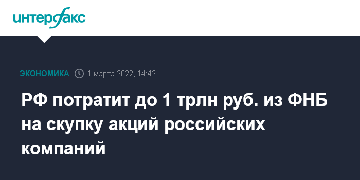 Москва. 1 марта. INTERFAX.RU - РФ потратит часть Фонда национального благосостояния на скупку акций российских компаний, которые обвалились на введении беспрецедентно жестких санкций против РФ.