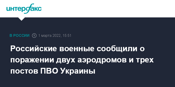 "1 марта Вооруженными силами Российской Федерации нанесен удар высокоточным оружием большой дальности воздушного и морского базирования. Поражены два аэродрома и три радиолокационных поста ПВО", - сказал официальный представитель Минобороны РФ Игорь Конашенков на брифинге.