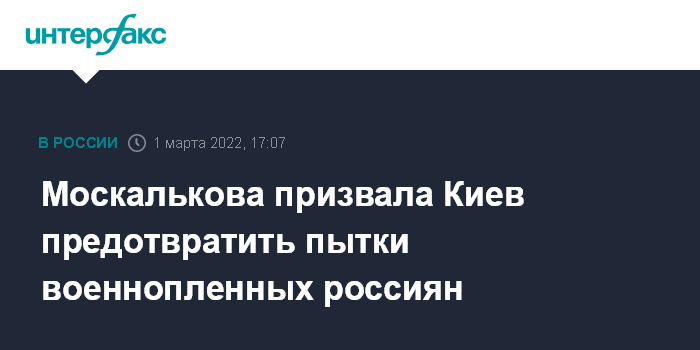 Москва. 1 марта. INTERFAX.RU - Уполномоченная по правам человека в РФ Татьяна Москалькова призвала омбудсмена Украины Людмилу Денисову предотвратить пытки российских военнопленных, сообщила во вторник пресс-служба Москальковой.