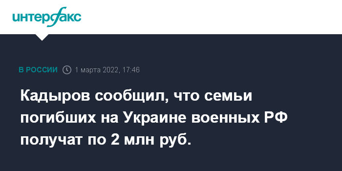 Москва. 1 марта. INTERFAX.RU - Семьи погибших на Украине российских военных получат более чем по 2 млн рублей, сообщил глава Чечни Рамзан Кадыров.