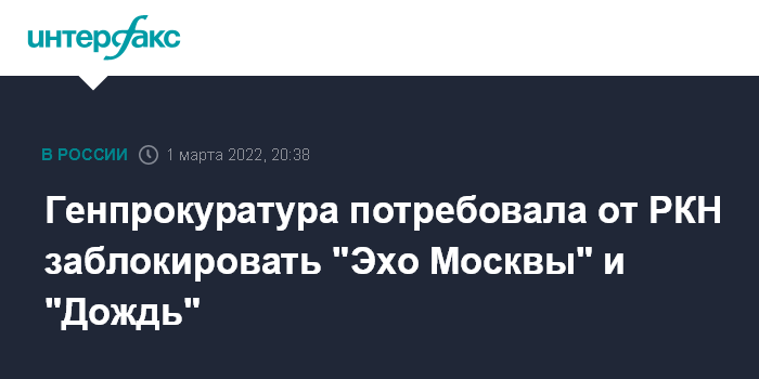 Москва. 1 марта. INTERFAX.RU - Генпрокуратура потребовала от РКН заблокировать "Эхо Москвы" и "Дождь" (признан СМИ-иноагентом).
