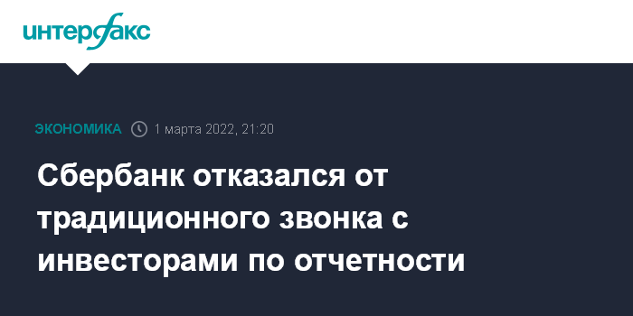 Москва. 1 марта. INTERFAX.RU - Сбербанк решил не проводить традиционный конференц-звонок с инвесторами и аналитиками по итогам публикации финансовой отчетности по МСФО.
