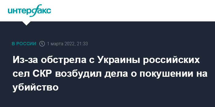 Москва. 1 марта. INTERFAX.RU - Следственный комитет России (СКР) возбудил дела о покушении на убийство в связи с артиллерийским обстрелом украинскими военными сел в Крыму и в Белгородской области, сообщается во вторник на сайте ведомства.