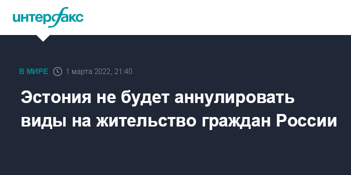 Москва. 1 марта. INTERFAX.RU - Министерство внутренних дел Эстонии сообщило, что не будет аннулировать виды на жительство граждан России, находящихся в стране на законном основании.