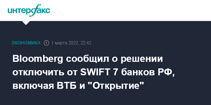 Bloomberg сообщил о решении отключить от SWIFT 7 банков РФ, включая ВТБ и "Открытие"