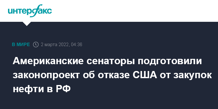 Москва. 2 марта. INTERFAX.RU - Группа американских сенаторов подготовила и представила Конгрессу законопроект о введении запрета на импорт Соединенными Штатами российской нефти, сообщила пресс-служба республиканца Роджера Маршалла, инициатора документа.