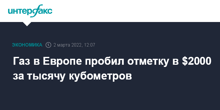 Москва. 2 марта. INTERFAX.RU - Спотовая цена газа в Европе днем в среду продолжает резкий рост - уже на 42% по отношению к уровню закрытия вторника.