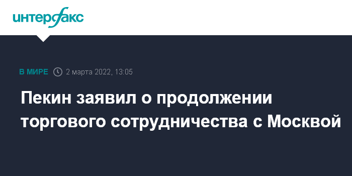Москва. 2 марта. INTERFAX.RU - Китай намерен продолжать сотрудничество с Россией в сфере торговли и не поддерживает "любые незаконные односторонние санкции". Об этом сообщает китайское телевидение со ссылкой на МИД страны.