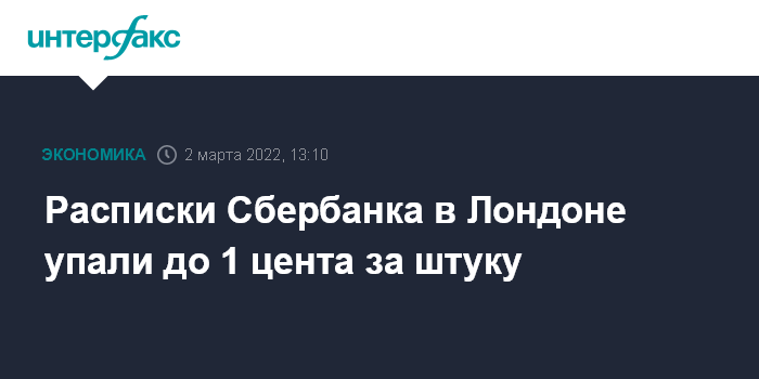 Москва. 2 марта. INTERFAX.RU - Падение расписок на российские акции на Лондонской фондовой бирже в среду достигло своего апогея, цены обновили свои минимумы на фоне усиления антироссийских западных санкций из-за военной операции России на Украине; стоимость расписок Сбербанка упала до 1 цента за штуку (расписка включает в себя 4 акции).