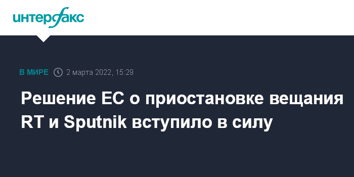 Решение ЕС о приостановке вещания RT и Sputnik вступило в силу