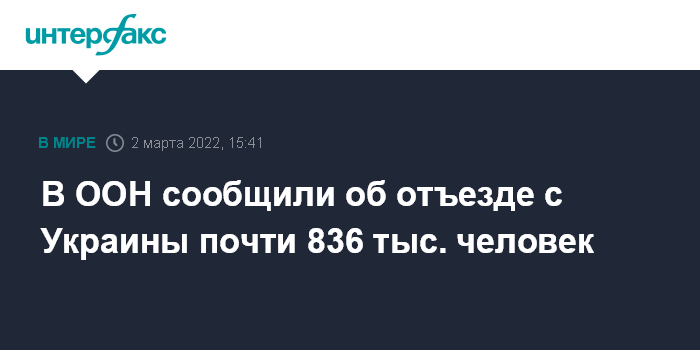 Москва. 2 марта. INTERFAX.RU - Почти 836 тысяч человек выехали с Украины в соседние страны с момента начала российской спецоперации в стране, сообщают западные СМИ в среду со ссылкой на управление верховного комиссара ООН по делам беженцев.