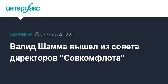 Москва. 2 марта. INTERFAX.RU - Независимый директор "Совкомфлота" Валид Шамма вышел из совета директоров компании. Изменения отражены на сайте предприятия.