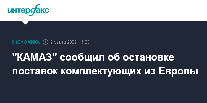 Москва. 2 марта. INTERFAX.RU - Поставки "КАМАЗу" комплектующих из Европы остановлены, компания сориентирует производство на грузовики традиционного модельного ряда третьего поколения (К3), сообщило корпоративное издание со ссылкой на первого заместителя генерального директора компании Юрия Герасимова.