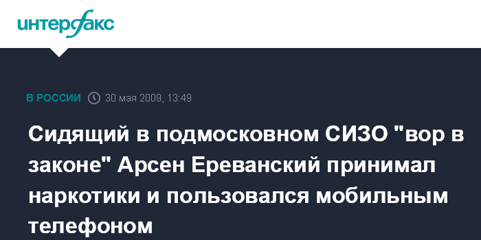 Москва. 30 мая. INTERFAX.RU - Известный вор в законе Арсен Мкртчян, находящийся сейчас в СИЗО № 5 подмосковной Каширы, уличен в употреблении наркотиков.