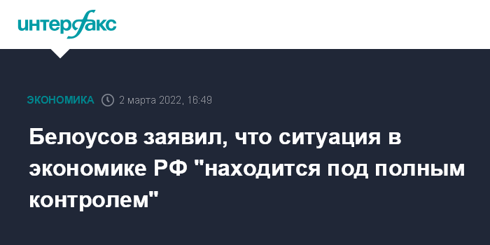 Москва. 2 марта. INTERFAX.RU - Ситуация в российской экономике, несмотря на санкции, находится под полным контролем, заявил первый вице-премьер РФ Андрей Белоусов по итогам встречи с РСПП.