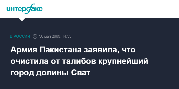 Москва. 30 мая. INTERFAX.RU - Пакистанские военные утверждают, что ими взят под контроль крупнейший город в долине Сват Мингора.