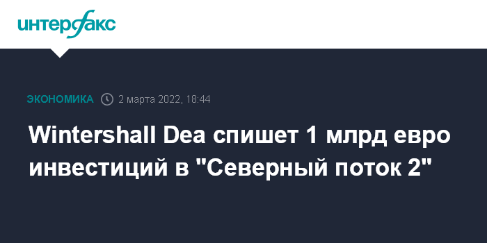 "Правление Wintershall Dea AG приняло решение не продвигать и не реализовывать какие-либо дополнительные проекты по добыче газа и нефти в России и списать финансирование проекта "Северный поток 2" в размере около 1 млрд евро", - говорится в релизе компании.