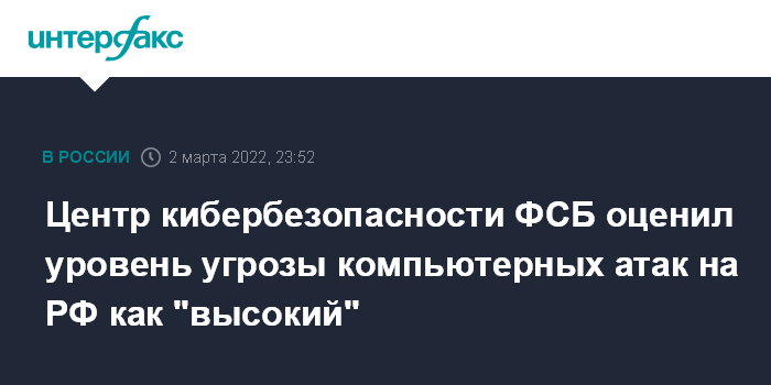 Москва. 2 марта. INTERFAX.RU - Созданный по указу руководства ФСБ Национальный координационный центр по компьютерным инцидентам (НКЦКИ) считает высоким уровень угрозы массированных компьютерных атак на информационные ресурсы РФ.