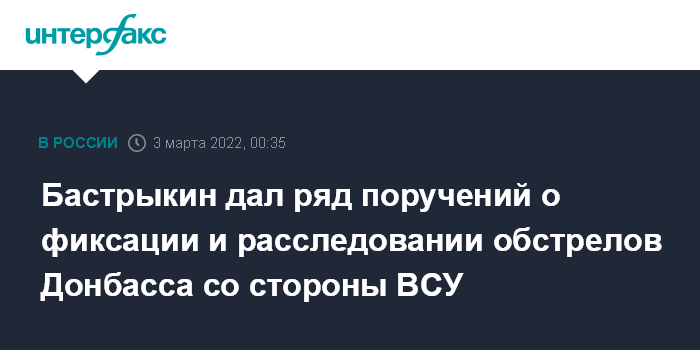 Москва. 3 марта. INTERFAX.RU - Председатель Следственного комитета РФ Александр Бастрыкин дал ряд поручений о фиксации и расследовании новых фактов обстрелов мирного населения Донбасса со стороны Вооруженных сил Украины, сообщает официальный сайт Следственного комитета.