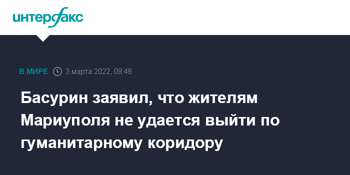 Москва. 3 марта. INTERFAX.RU - Жители Мариуполя не могут воспользоваться гуманитарными коридорами, открытыми для выхода гражданского населения, сообщил в четверг представитель народной милиции Донецкой народной республики Эдуард Басурин.