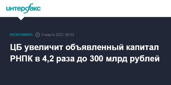 Москва. 3 марта. INTERFAX.RU - Банк России принял решение об увеличении объявленного капитала дочерней перестраховочной компании АО РНПК более чем в 4 раза – с 71 млрд рублей до 300 млрд рублей, говорится в сообщении регулятора.