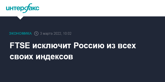 Москва. 3 марта. INTERFAX.RU - Индексный провайдер FTSE объявил об исключении России из всех своих индексов, сообщается в отчете стратегов "ВТБ Капитала" Дарьи Батышкиной и Андрея Кузнецова.