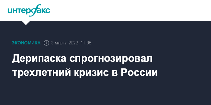 Москва. 3 марта. INTERFAX.RU - Российский бизнесмен Олег Дерипаска прогнозирует, что Россию ждет жесточайший кризис минимум на три года из-за событий на Украине.