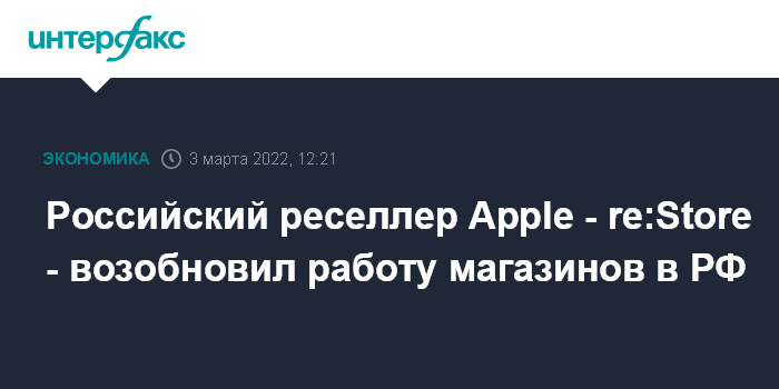 Москва. 3 марта. INTERFAX.RU - Российский реселлер техники Apple - re:Store - возобновил работу магазинов в РФ, которая была приостановлена накануне для оценки ситуации на рынке, сообщили "Интерфаксу" в пресс-службе Inventive Retail Group (IRG), управляющей сетью магазинов.