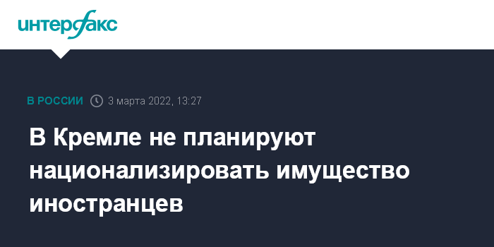 Москва. 3 марта. INTERFAX.RU - Вопрос о национализации имущества иностранцев в Кремле не рассматривается, заявил пресс-секретарь президента РФ Дмитрий Песков.