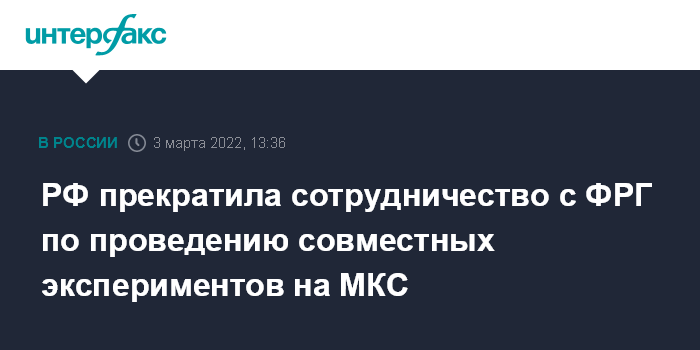 Москва. 3 марта. INTERFAX.RU - Глава "Роскосмоса" Дмитрий Рогозин заявил о прекращении сотрудничества с Германским центром авиации и космонавтики (DLR) по проведению научных экспериментов на МКС в связи с санкциями Германии в отношении РФ.