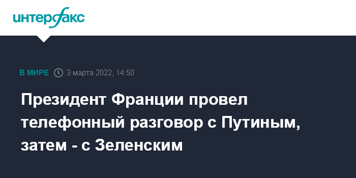 Москва. 3 марта. INTERFAX.RU - Президент Франции Эммануэль Макрон в четверг провел телефонный разговор с президентом РФ Владимиром Путиным, а затем - с президентом Украины Владимиром Зеленским, сообщает телеканал BFMTV со ссылкой на Елисейский дворец.